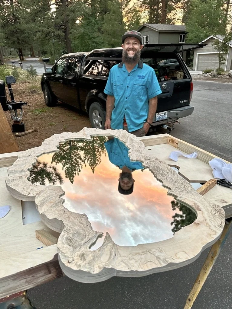 50” x 32” 3D Topographic mountain frame enclosing a water-jet cut glass mirror of the shoreline of Lake Tahoe